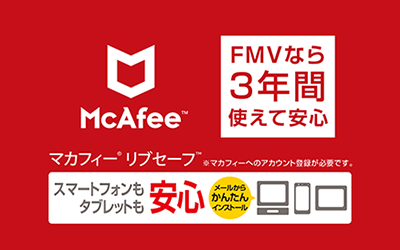 セキュリティソフト「マカフィー®リブセーフ™3年版」を、3年間無料で使えます。FMVはもちろん、所有する他のパソコンやタブレット、スマートフォンにもご使用いただけます。