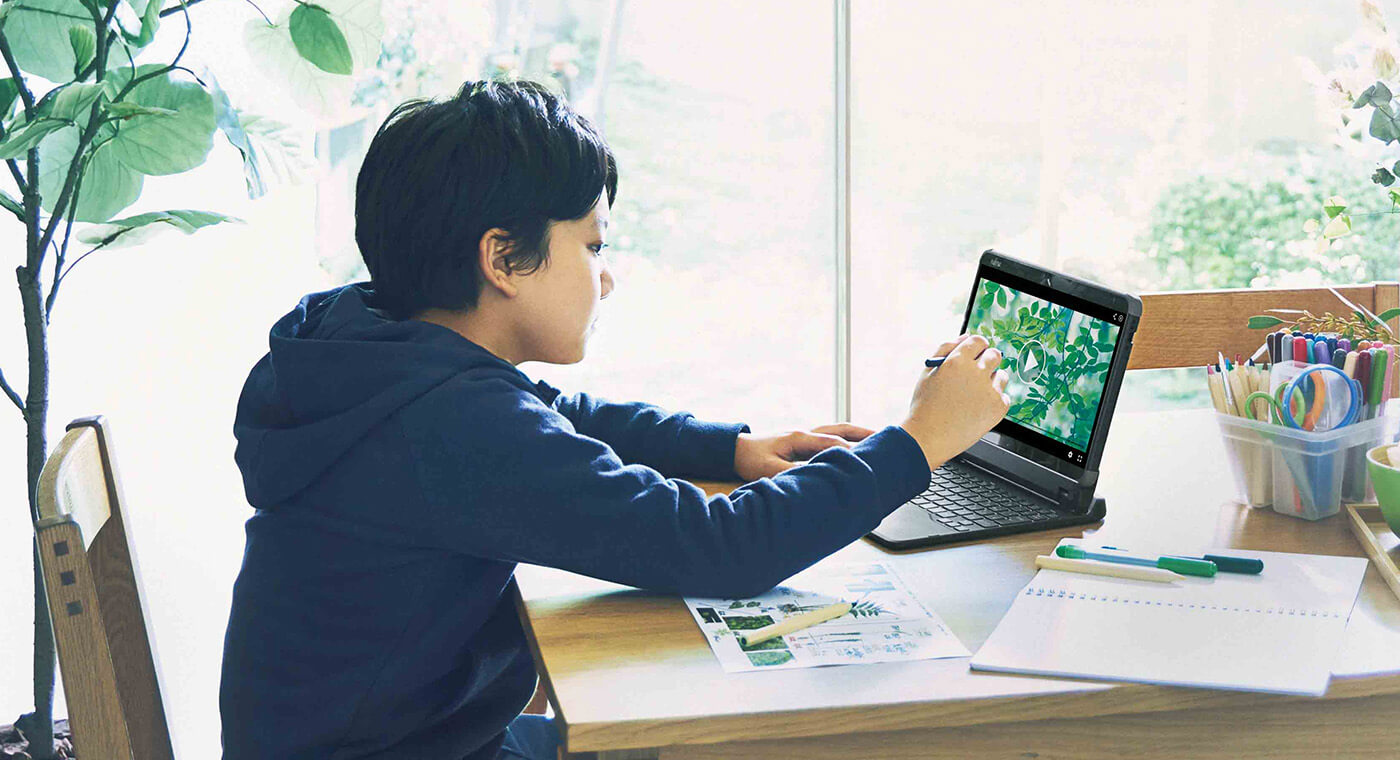 コンパクトながら画面が大きく見やすいため、お子さまが動画を見て学習したり、調べものもしやすい。またリビングになじむデザインなので、家族みんなで使用するのにもおすすめ。