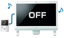 PCの電源がオフのときでも、PCとデジタルオーディオプレーヤーを別売のケーブルで接続するだけで、音楽を楽しむことができます(注3) 。また、電源オフUSB充電機能で、音楽を楽しみながら、デジタルオーディオプレーヤーなどの充電も可能です。