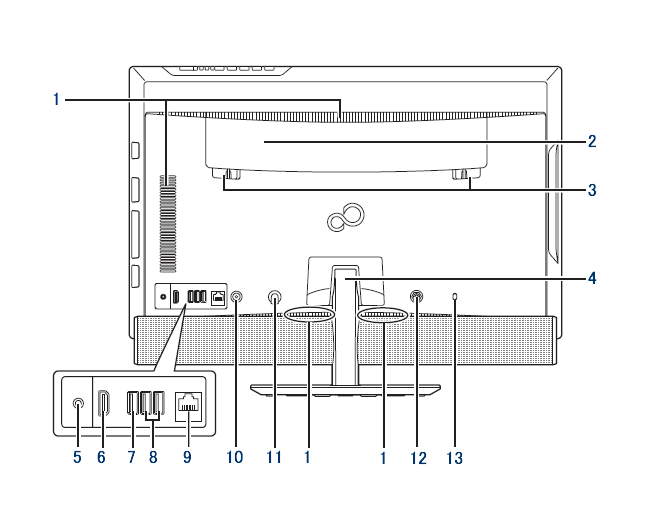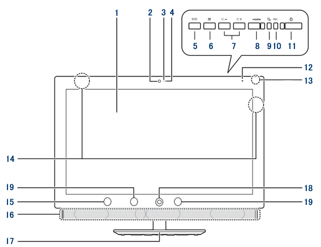 1. 液晶ディスプレイ 2. Webカメラ 3. Webカメラ状態表示LED 4. デジタルマイク 5. ECO(エコ)ボタン 6. 画面オフボタン 7. 音量調整ボタン 8. 外部入力ボタン、外部入力ランプ 9. ディスクアクセスランプ(