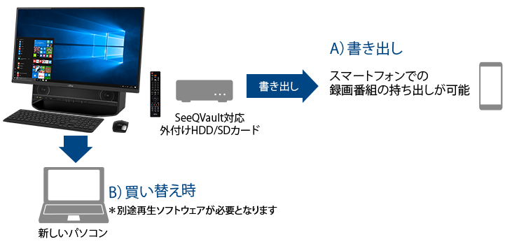 さまざまな対応機器で再生互換性のある「SeeQVault(注1)」に対応。録画した番組をそのままの画質で対応のmicroSDカードに書き出すことができるので、持ち出しが可能に。フルHD画質のまま外出先でもスマートフォンやタブレットで楽しめます(注2)。