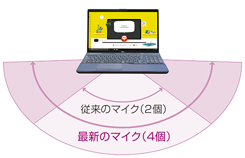 「Cortana 高集音マイク」にも対応。約4m(注1)先から音声認識が可能なため、少し離れた場所からでも、Cortanaを利用できます。さらに、マイクを4つ搭載(注2)したことで広い範囲の音を正確に認識(注1)できるようになり、「いつもアシストふくまろ」がさらに使いやすくなりました。