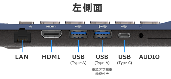 高速でデータ転送できるUSB 3.1 Type-C(注1)(注2)(注3)ポートを左側面に1ポート、USB 3.0 Type-Aのポートを左側面に2ポート(うち1ポートは電源オフ充電機能付)搭載、USB 2.0 Type-Aのポートを右側面に1ポート搭載しているので、外部機器との接続に困りません。