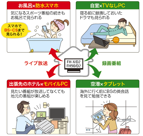 さまざまな対応機器で再生互換性のある「SeeQVault(注1)」に対応。録画した番組をそのままの画質で対応のmicroSDカードに書き出すことができるので、持ち出しが可能に。フルHD画質のまま外出先でもスマートフォンやタブレットで楽しめます(注2)。