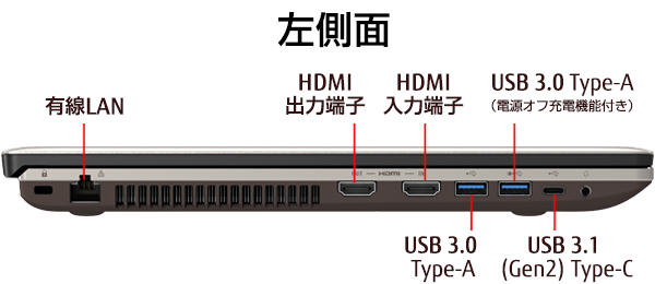 高速でデータ転送できるUSB 3.1 Type-C(注1)(注2)ポートを左側面に1ポート、USB 3.0 Type-Aのポートを左側面に2ポート(うち1ポートは電源オフ充電機能付)搭載、USB 2.0 Type-Aのポートを右側面に1ポート搭載しているので、外部機器との接続に困りません。