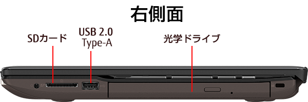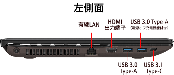 高速でデータ転送できるUSB 3.1 Type-C(注1)(注2)(注3)ポートを左側面に1ポート、USB 3.0 Type-Aのポートを左側面に2ポート(うち1ポートは電源オフ充電機能付)搭載、USB 2.0 Type-Aのポートを右側面に1ポート搭載しているので、外部機器との接続に困りません。