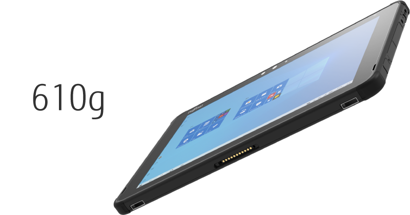 優れた防水/防塵性能に加え、高い堅牢性を兼ね備えた本体。パワフルなCPUと大容量のメモリを詰め込みながらも、液晶画面のガラス薄型化、筐体の薄肉化など細部部品まで見直しを行い、本体質量約610gを実現しています。さらに、持ちやすさを追求した六角形スタイラスペンも本体収納が可能。使いやすさも兼ね備えています。