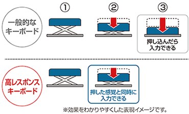 一般的なキーボードと異なり、キーを最後まで押し込まなくてもキー入力を検出します。軽いタッチや高速タイピングでも入力抜けが少ない、確実なキー操作ができます。