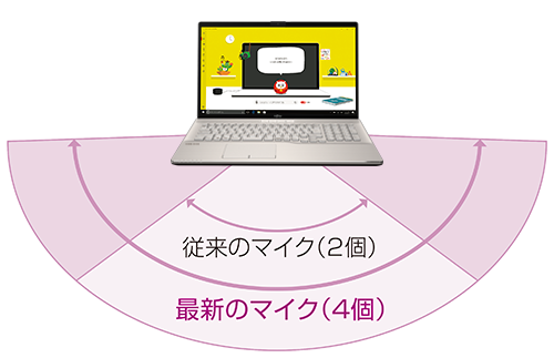 「Cortana 高集音マイク」にも対応。約4m(注1)先から音声認識が可能なため、少し離れた場所からでも、Cortanaを利用できます。さらに、マイクを4つ搭載したことで広い範囲の音を拾い、ビデオ通話や「いつもアシストふくまろ」の会話も楽しめます。