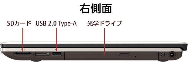 高速でデータ転送できるUSB 3.2 Type-C(注1)(注2)ポートを左側面に1ポート、USB 3.2(Gen1)Type-Aのポートを左側面に2ポート(うち1ポートは電源オフ充電機能付)搭載、USB 2.0 Type-Aのポートを右側面に1ポート搭載しているので、外部機器との接続に困りません。