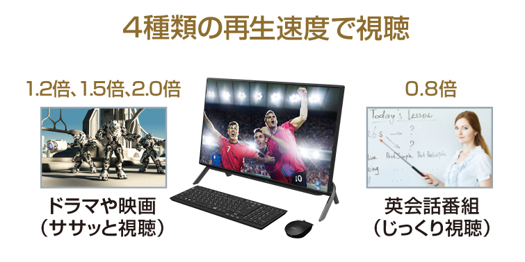 また、録画番組の視聴では本編以外のスキップ再生をはじめ、スポーツ番組などで盛り上がっているシーンのダイジェスト再生、声の高さがそのままでの変速再生(0.8倍、1.2倍、1.5倍、2.0倍)にも対応しているため、様々な番組を幅広く楽しめます。さらに、ライブ放送や録画番組のリモート視聴にも対応(注2)しているため、他のパソコンやスマホ、タブレットでも楽しめます。
