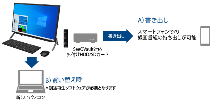 さまざまな対応機器で再生互換性のある「SeeQVault(注1)」に対応。録画した番組をそのままの画質で対応のmicroSDカードに書き出すことができるので、持ち出しが可能に。フルHD画質のまま外出先でもスマートフォンやタブレットで楽しめます(注2)。