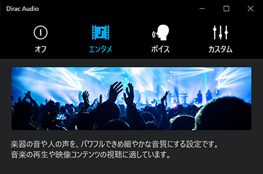 音響補正技術Diracが、音楽や動画視聴などのエンターテインメント用途からビデオ通話まで利用シーンに合った音響設定を提供します。パワフルできめ細やかな音質にする「エンタメ」、人の声を認識しやすい音質の「ボイス」、好みに合わせて細かな調整ができる「カスタム」の3つの音響設定が選択できます。