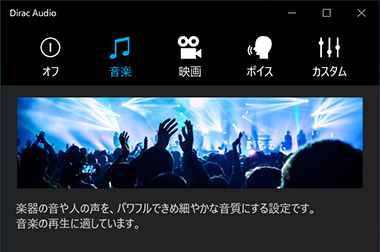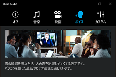 Diracが提供する音響補正技術により、自宅のリビングが臨場感あふれる空間に早変わり。パワフルできめ細やかなサウンドの「音楽」、迫力あるパノラマサウンド の「映画」、ビデオ通話に適した人の声を認識しやすい音質の「ボイス」、好みに合わせて 細かな調整ができる「カスタム」からシーンに合わせて4つの音響設定が選択できます。