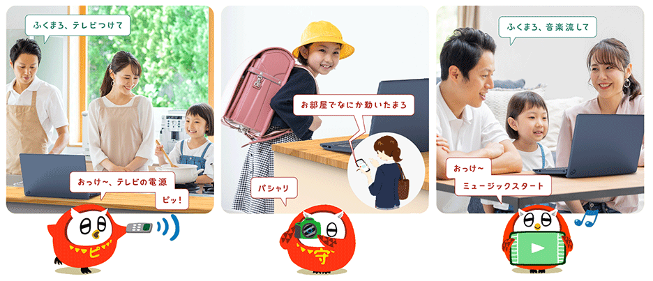 ふくまろに音声やチャットで話しかけると、パソコンの音楽や写真を再生したり、家電の操作(注1)や、外出中のお部屋の写真をスマホに送信してくれたりします。「いつもアシスト ふくまろ」の詳細はこちらをご覧ください。