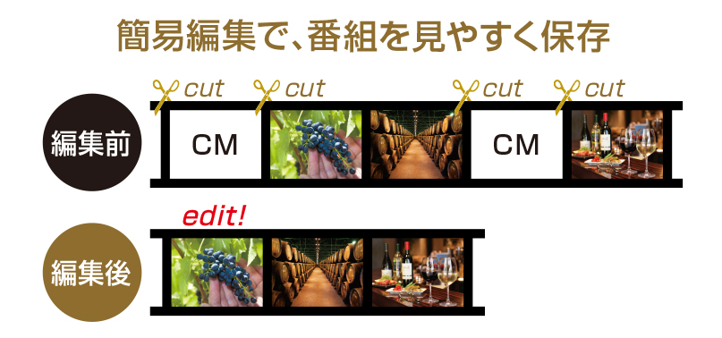 録画番組の本編の自動抽出(注3)に加えて、簡易編集もできるため、番組を見やすく保存することができます。