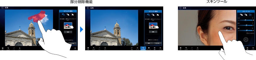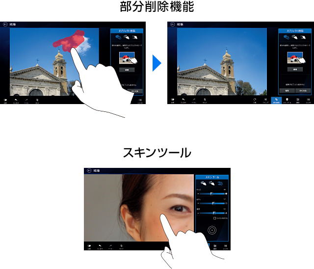 写真の彩度、色調の調整をはじめ、写真の不要な部分を取り除く「部分削除」や肌を美しく見せる「スキンツール」などの編集機能、フレームやスタンプで写真を楽しく彩るデコレーション機能といった、多彩なレタッチ機能を搭載しています。