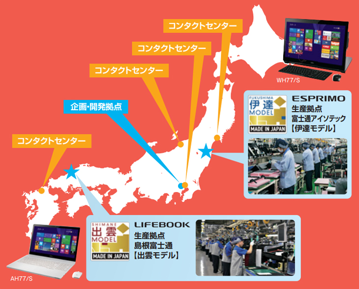 富士通はパソコン、タブレット本体の部品受入検査・CPU組み込み・部品組み込み・最終組み立て・出荷試験(品質管理)を日本国内で実施しています。