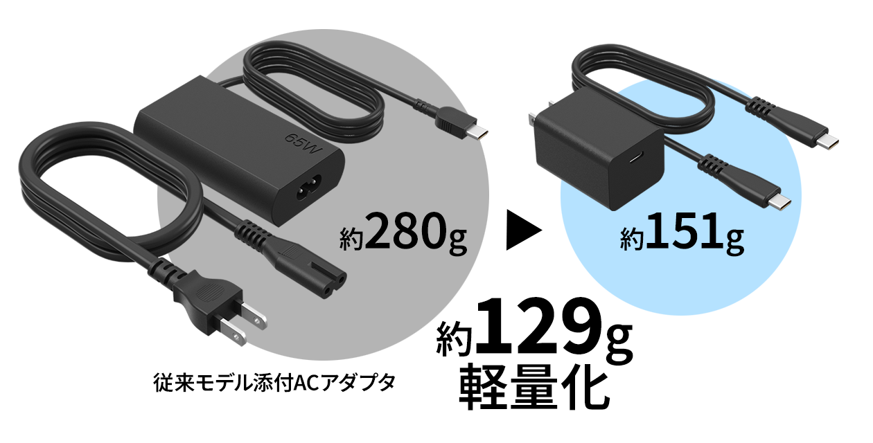 本体だけでなく、一緒に持ち歩くACアダプタも大幅に小型軽量化。従来から50%近い軽量化で、手持ちの荷物がどんどん軽くなります。