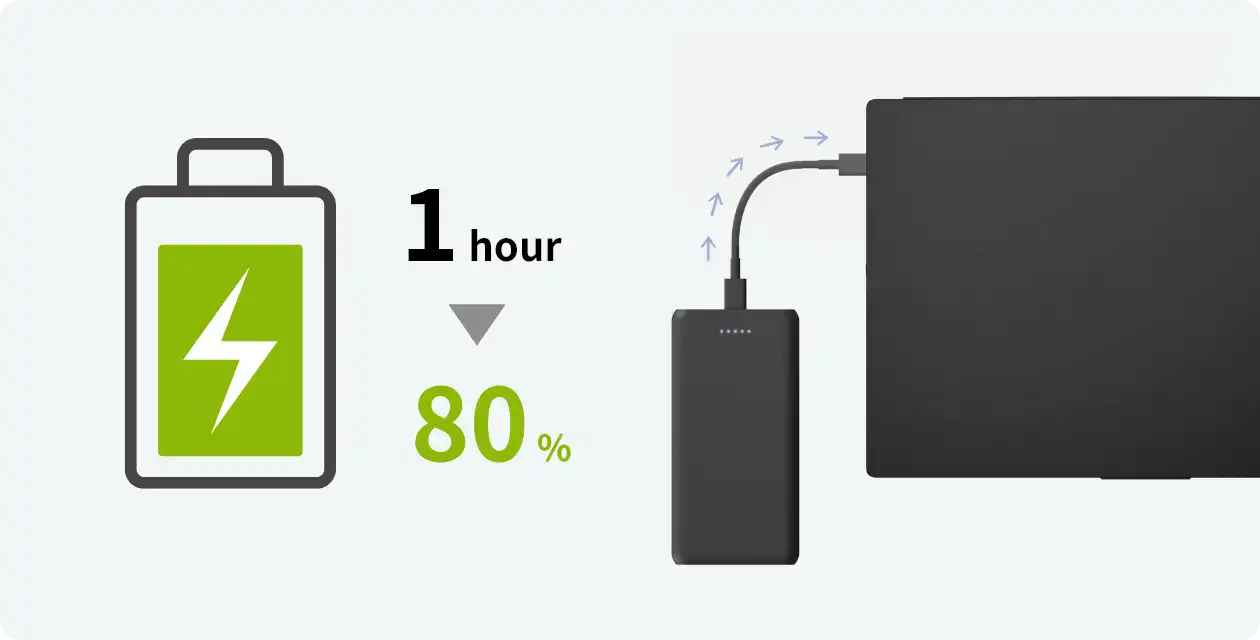 約1時間で満充電の約80%まで充電できる急速充電に対応しており、突然の外出前にも安心です。お手持ちのモバイルバッテリー※3での充電も可能なので、外出先でも余裕を持って使えます。