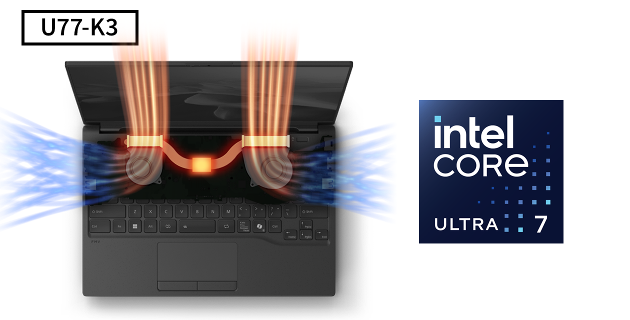 U77-K3は熱効率を徹底的に考え抜いた排熱設計。CPUを強力に冷却するデュアルファンを搭載することで28WのCore Ultra 7 155Hの性能を引き出し、より快適な作業を行えます※4。