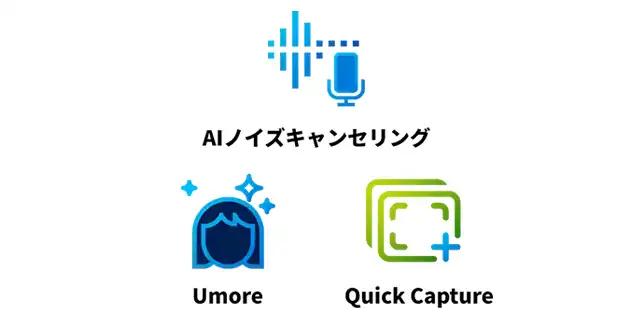 AIの力で自分の声も相手の声も自動で補正してくれる「AIノイズキャンセリング」と顔を補正してくれる「Umore」で、突然のWeb会議にも余裕で対応。さらに「Quick Capture」を使えば、自動で画面のスクリーンショットも保存されるので便利。