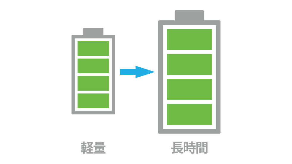カスタムメイドモデルは軽量な「標準バッテリー」と、長時間駆動を実現する「大容量バッテリー」をご購入時に選択いただけます。(注2)