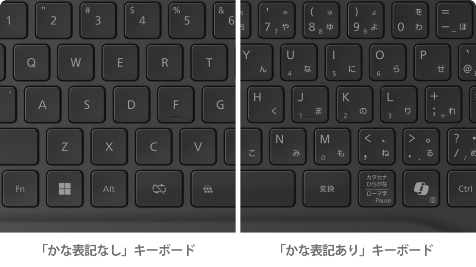 カスタムメイドモデルでは、カラーに「ピクトブラック」を選択時、日本語表記の無いすっきりとした見た目の「日本語配列かな表記なしキーボード」の他に、日本語が表記された「日本語配列かな表記ありキーボード」を購入時に選べます。