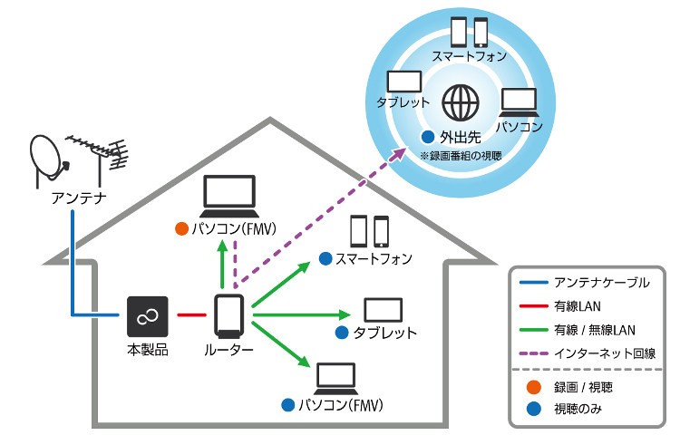 FMVならTV番組を録画することも可能。さらに、FMVの独自機能「My Cloud」を利用すれば、録画した番組を外出先からタブレットやスマートフォンなどで楽しむことができます。