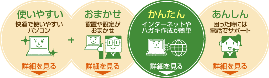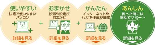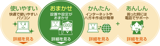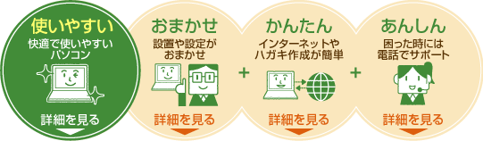 - 「パソコンをはじめて利用する」「あまり利用したことがない」というお客様でも、簡単に使い始めることができます。