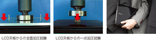 常に持ち運ぶモバイルPCだからこそ、堅牢性をとことん追求しました。様々なモバイルシーンを想定して、LCD天板からの全面加圧(約200kgfを再現して実施)や、一点加圧(約35kgfを再現して実施)の耐久試験を実施するなど、通勤ラッシュの電車の中でも耐えられる高い堅牢性を実現しています。(注14)