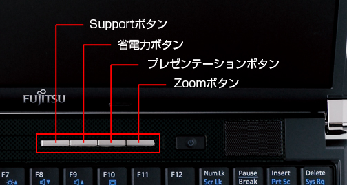 | Support(サポート)ボタン | 「FMVサポートナビ」、「トラブル解決ナビ」を起動する。 |