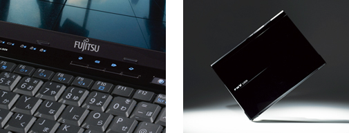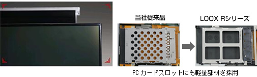 強度を保ちつつ、液晶表面のガラスを極限まで薄型化。さらに、液晶周りに金属の補強部品を使わないフレームレス液晶を採用。また、PCカードスロットなどにも、厳選した軽量部品を採用しています。