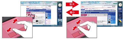 フラットポイント上で2本の指でつまんだりひらいたりする操作をすると、画像やウィンドウ内の画面が拡大や縮小表示されます。
