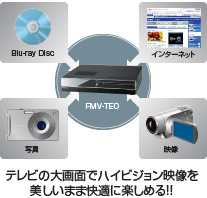 市販の高精細なBku-ray Discの映画を、接続したテレビの大画面で楽しめます。またデータ容量の大きいハイビジョン映像も、ハイビジョン画質のまま保持できます。