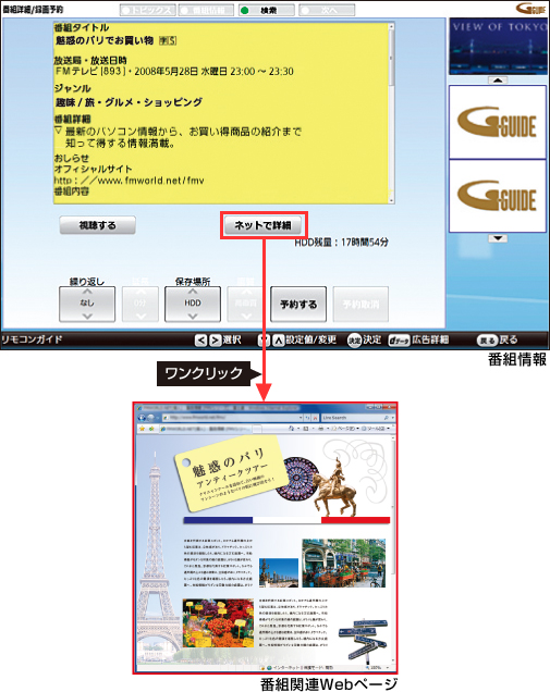 電子番組表「G-GUIDE」で番組情報を表示したとき、番組情報に含まれている番組関連ホームページを、ワンクリックで閲覧することができます。