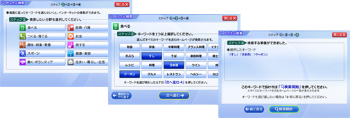どんな言葉で検索したら良いのかわからない、文字入力が苦手という方にオススメ。表示された言葉を選んでいくだけで、知りたいインターネットの情報にたどり着くことがきます。