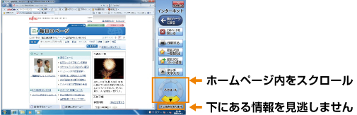 画面右側にある「らくらく操作パネル」で、マウスを使わずにタッチ操作だけでインターネットを楽しめます。 |