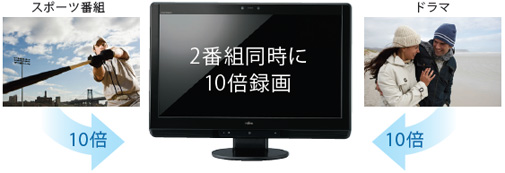 地上・BS・110度CSデジタル放送対応のテレビチューナーを2つ搭載。見たい番組が重なっても2番組同時録画できます。さらに、2番組同時長時間10倍録画にも対応。