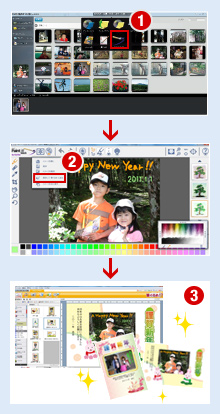 お絵描きした写真が自動で挿入されるので、面倒な操作なしに、お好みのテンプレートをタッチするだけでオリジナル年賀状の完成。