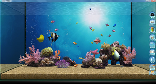 水槽のレイアウトを変えたり、魚にエサをあげて、熱帯魚を観賞して楽しめる『とびだす熱帯魚!』を収録。2Dでも楽しめるこのソフトウェアを『TriDef 3D(注1)』で起動することで、熱帯魚が泳ぐ姿を3Dとして楽しめます。