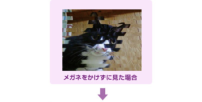 添付のメガネをかけると、左目には左目用の映像、右目には右目用の映像だけが見え、立体視することができます。