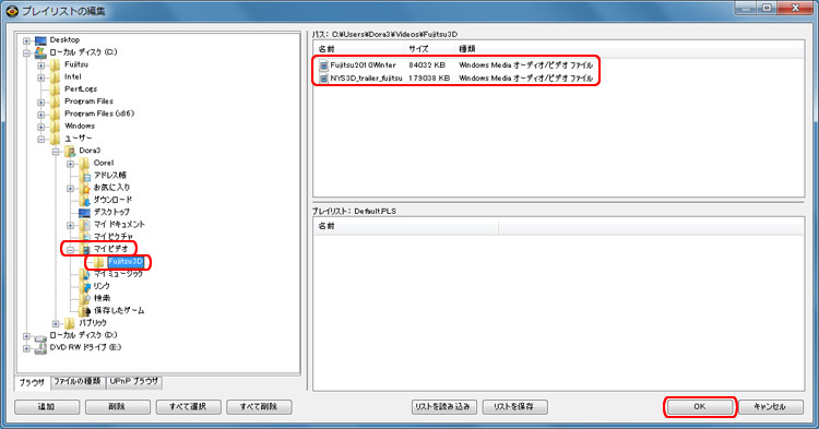 - 左側の「マイビデオ」→「Fujitsu3D」をクリックし、右上に表示された動画ファイルをダブルクリックし、「OK」をクリックします。