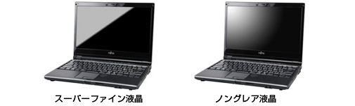 「スーパーファイン液晶」または、「ノングレア液晶」から選択できます。「ノングレア液晶」は表面に光沢処理が施されていないため、蛍光灯などの映りこみを抑えることができます。