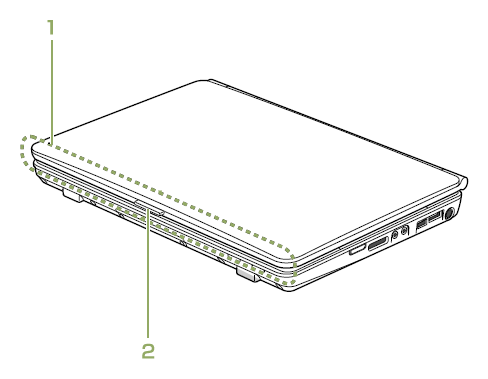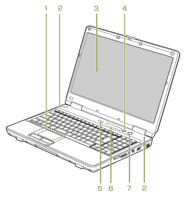 - 注2:ご購入時は、ACアダプタが接続されている状態で、かつログインしている時に、周囲が点灯する様に設定されています。設定を変更する場合は、「スタート」►「すべてのプログラム」►「省電力ユーティリティ」►「ランプオフ設定−省電力ユーティリティ」の順にクリックし、設定を変更してください。