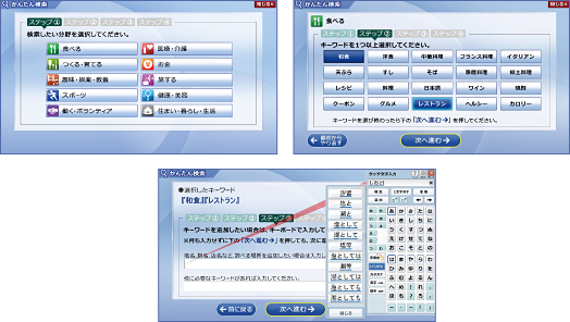 どんな言葉で検索したら良いのかわからない、文字入力が苦手という方にオススメ。表示された言葉から選んでタッチしていくだけで、インターネット上にある知りたい情報にたどり着くことがきます。 |