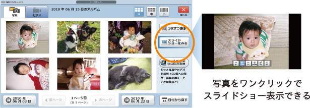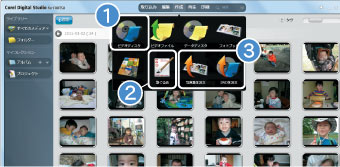 撮りためた写真・動画をかんたんに編集して、ビデオディスクの作成からポストカードの作成まで、思い出画像のさまざまなオリジナル作品を作ることができます。