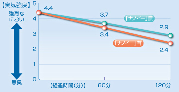 | 注3 | : | 【試験依頼先】パナソニック電工解析センター(株)【試験方法】6畳間の試験容器内で6段階臭気強度表示法による検証。 【脱臭の方法】ナノイーを放出。【対象】付着したタバコ臭。【試験結果】120分で臭気強度2.4に低減。臭気強度が1下がるとは、90%の低減を意味します(臭気強度1ランクとは「やっと感知できる非常に弱いニオイ」のレベルです)。臭気効果は、周囲環境(温度・湿度)、運転時間、臭気・繊維の種類によって異なります。試験番号:E02-110601TK-01 |