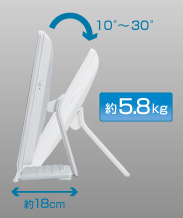 約5.8kgの軽量ボディーと奥行き約18cmの省スペース設計。液晶下部にキーボードを収納でき、お気に入りの場所への設置もスッキリ。さらに、10°〜最大30°まで無段階にチルトが可能で、使う人に最適なポジションに調整できます。