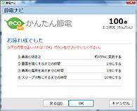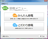 おすすめの節電設定をやさしく案内 「かんたん節電」では「画面の明るさ調整」、「画面の電源オフ」、「スリープまでの時間設定」等、初心者にもわかりやすいウィザード形式で設定することができます。 |